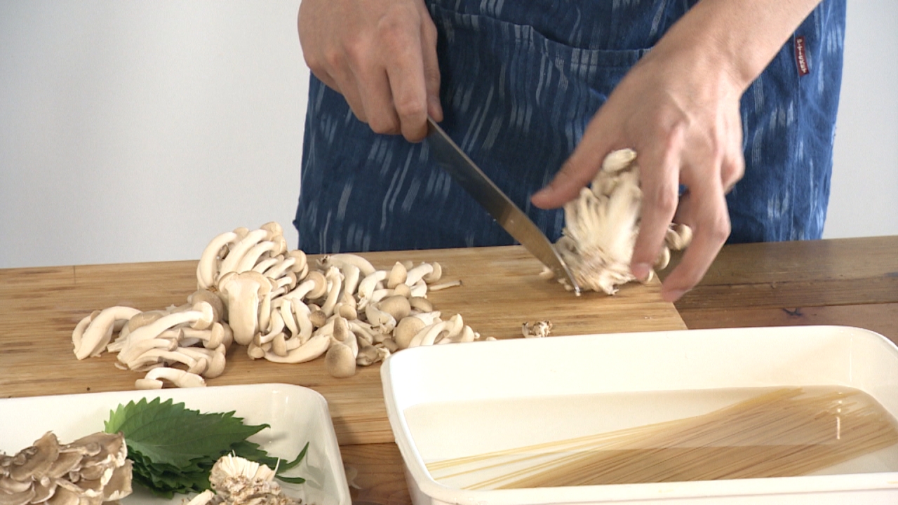 ② きのこは石づきを取ってほぐす