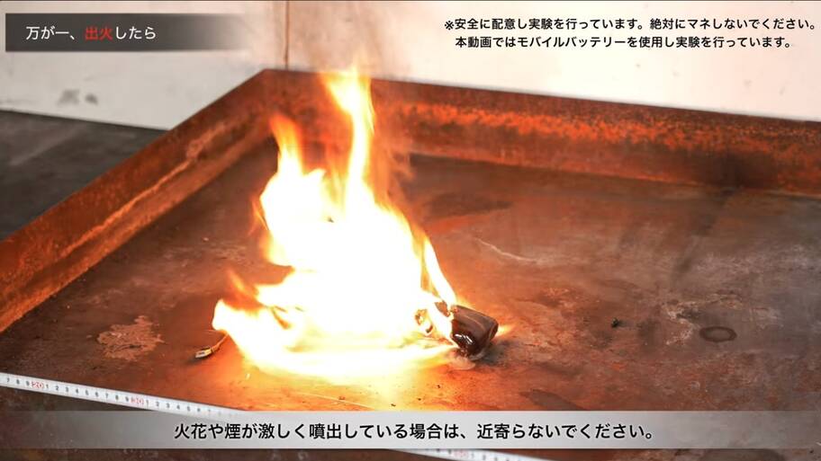 動画によると、万が一出火し、火花や煙が激しく噴出している場合は、無理に消そうとせず「近寄らない」ことが最優先。リチウムイオン電池の燃焼は激しく、爆発的に炎が噴き出すことがあるため、身の安全を確保することが第一なのだそうです。