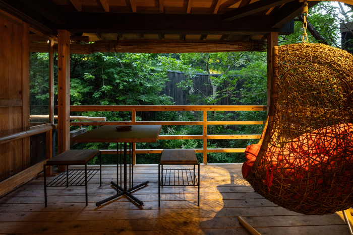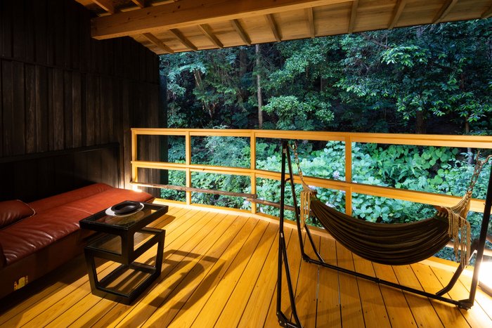 テラス付きの離れにはハンモックなども。川のせせらぎを聞きながら癒しの時間が楽しめそうです。