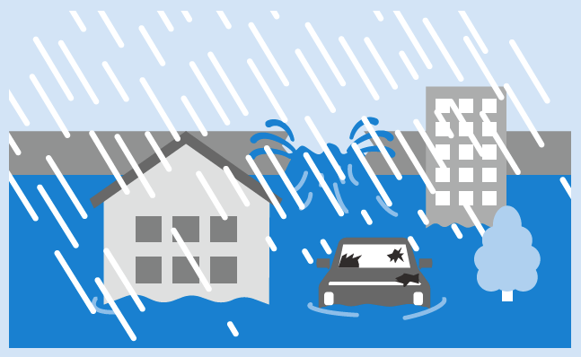 大雨や融雪などにより、堤防が決壊したり河川の水が堤防を越えたりする。