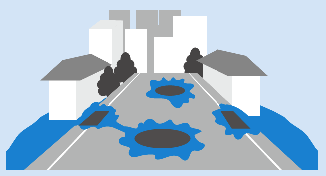 大雨などにより排水が追いつかず、用水路や下水溝などが溢れて氾濫し、住宅や田畑が水につかる。