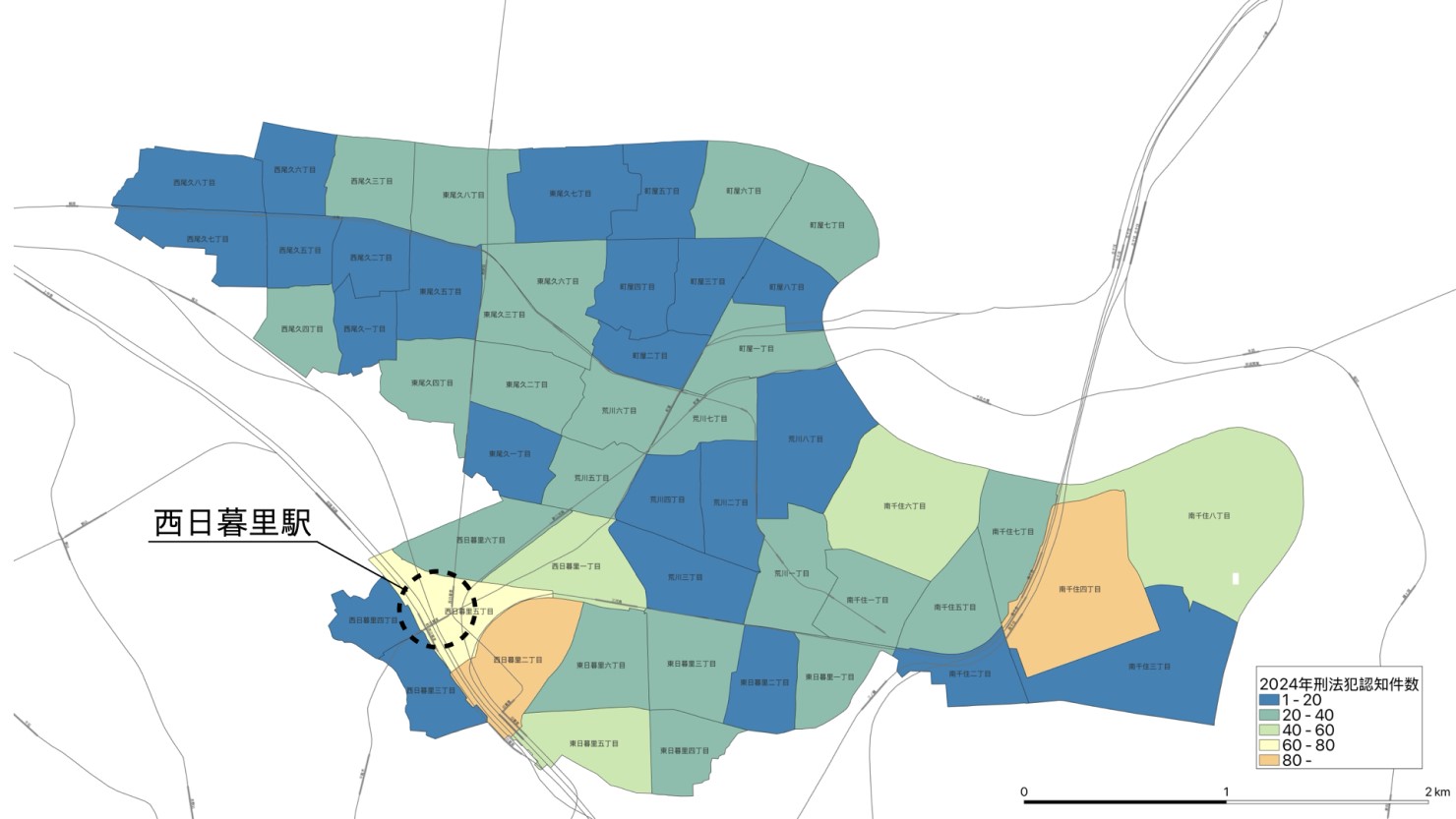 西日暮里駅のある西日暮里地域(西日暮里一丁目〜六丁目)の刑法犯認知件数は2024年統計では249件となっており、荒川区全体の約19%(区全体は1,328件)を占めます。上図の町丁別の認知件数をご覧いただくと西日暮里駅周辺では、橙色の部分が多く、犯罪認知件数が多いことが見て取れます。