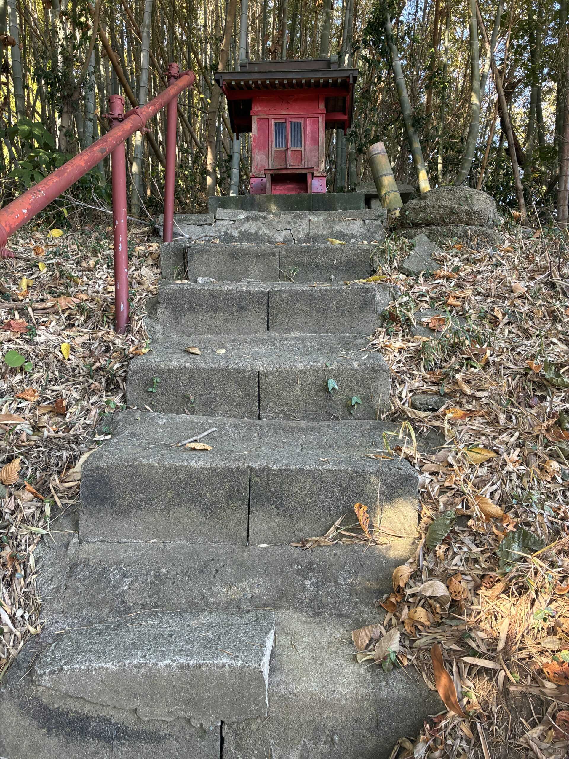 真っ赤な鳥居をくぐると階段があり、お社と小さな祠が鎮座されています。火の神が祀られる神社には、火で燃える事がない石でできた祠が祀られている事がありますが、こちらの祠もそのような意味でしょう。