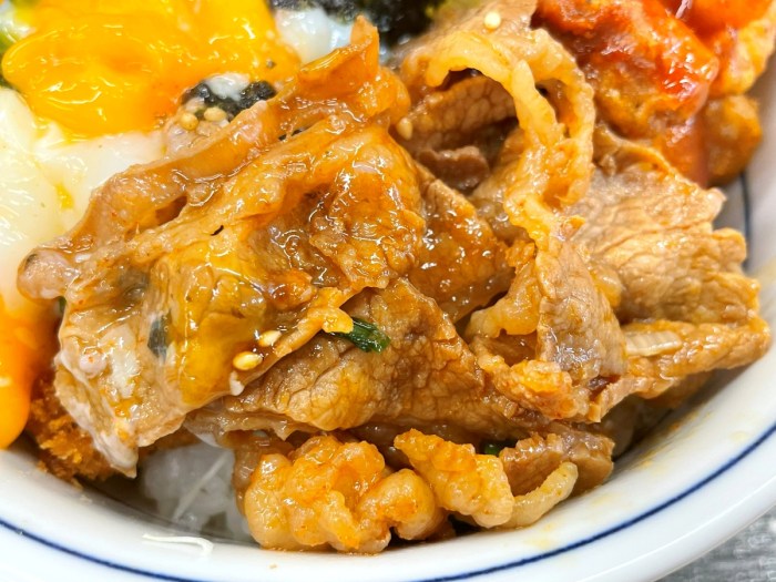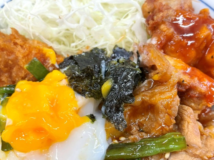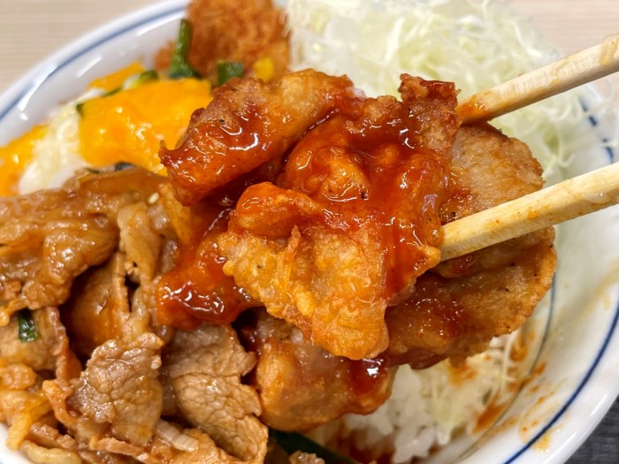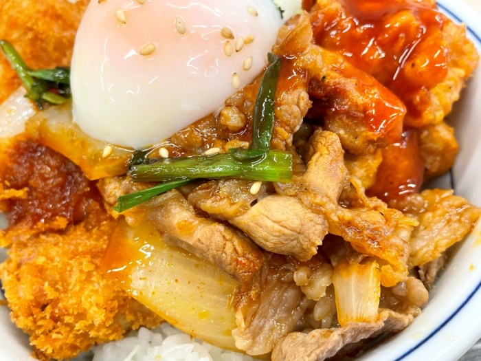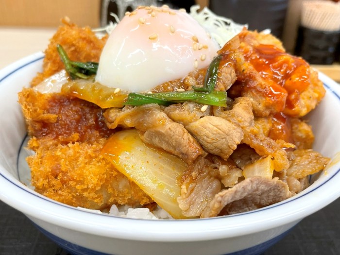 『牛豚鶏のプルコギビビンカツ丼』はその名の通り、一つの丼の中に牛肉・豚肉・鶏肉を同居させた、さながらシェアハウスの如き超カオス飯だ。
