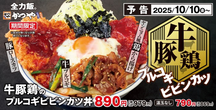 公開された画像を見た時からヤバそうな予感はしていた。本日2025年10月10日より期間限定で販売開始となった「かつや」新商品、その名も『牛豚鶏のプルコギビビンカツ丼』。