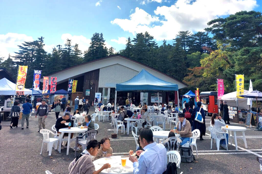 紅葉シーズンに合わせ開催されるマルシェ。ヤホール前駐車場には、フードやドリンク、食品加工品といった飲食ブース、おもてなし広場テラスには、衣料・手芸品、アクセサリー・クラフト雑貨などの物販ブースが並びます。弥彦エリアでは、紅葉ライトアップ(同期間開催)も行われますので、併せて楽しみましょう。