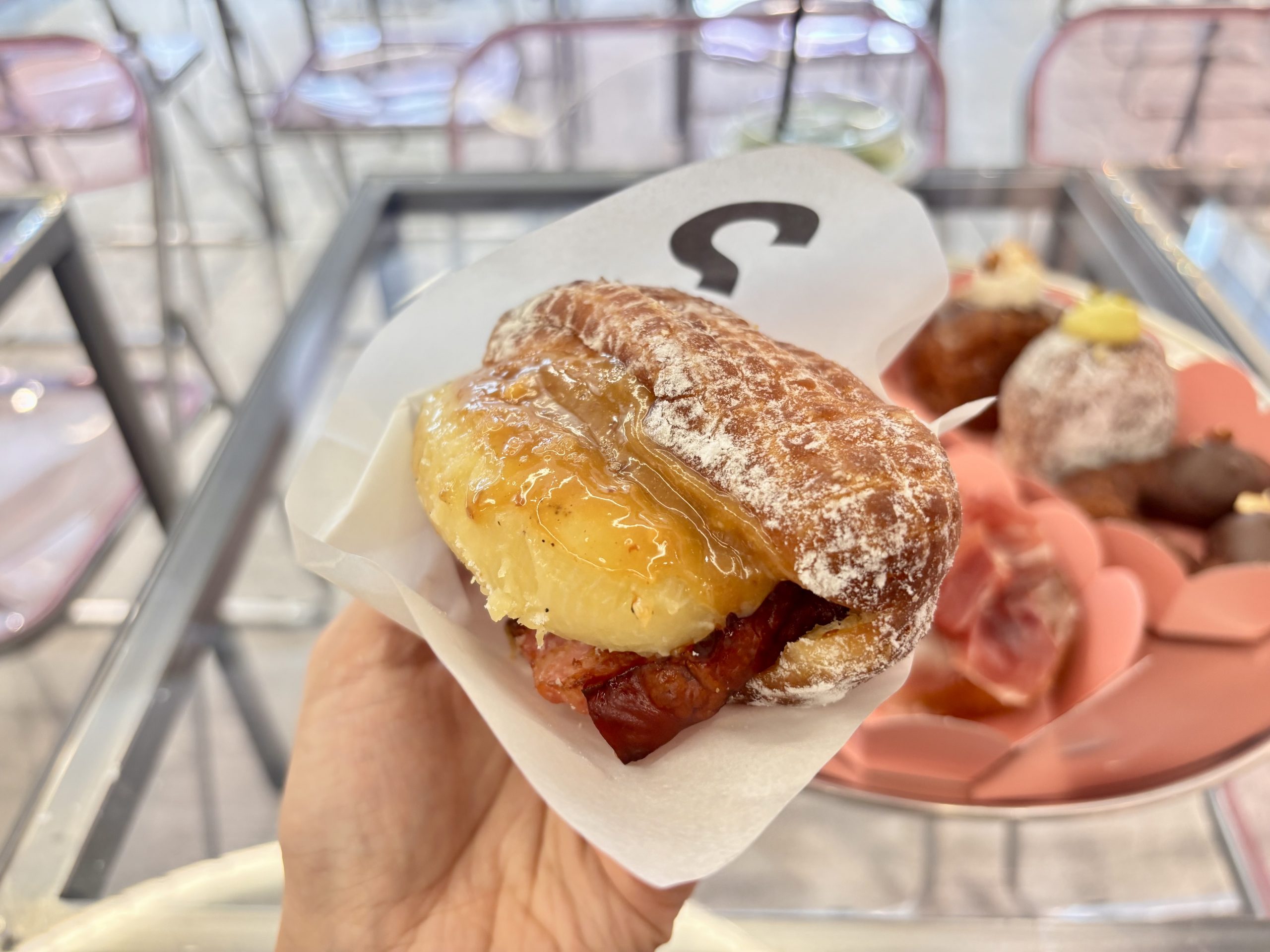 ドーナツ生地に挟んだ分厚いベーコンとバナナ、そこにピーナッツソースをかけた甘じょっぱい系。バナナの程よい甘みとベーコンの塩味、ピーナッツの香ばしさが加わることで生まれる味わいのトライアングルに「これは…!」と唸ってしまうおいしさです。