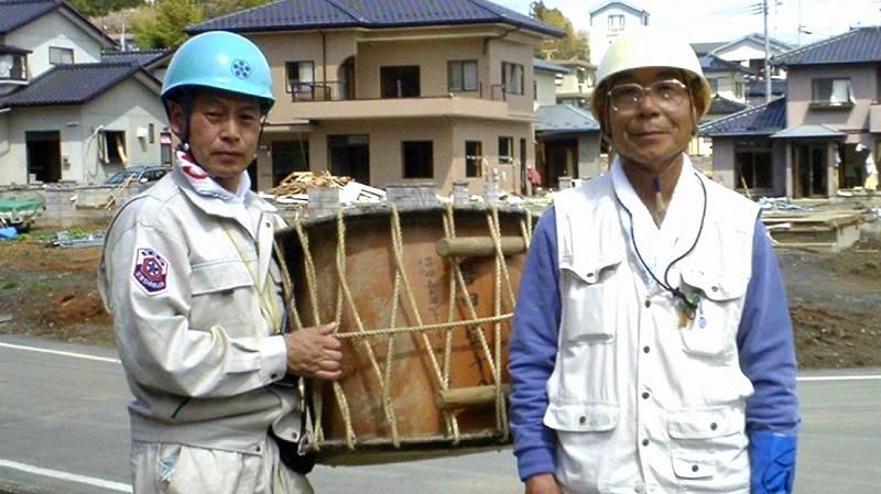 津波のあとの片付けを手伝っていると、町内会館の片隅で泥にまみれた太鼓を見つけました。