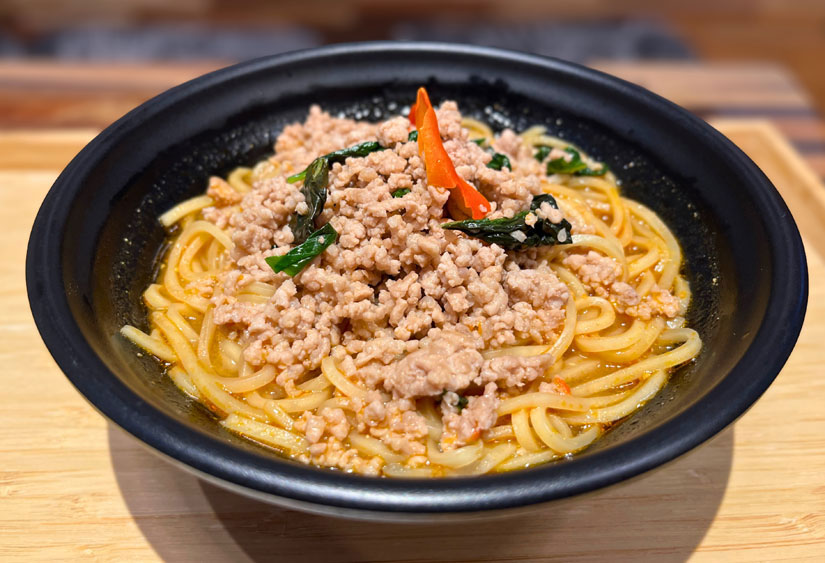 本場のホーリーバジルと一緒に炒めた鶏ひき肉が魅力の「タイのガパオラーメン」。昆布出汁に信州味噌を合わせたスープが、スパイス香るひき肉の旨みをしっかり受け止め、抜群の相性を生み出しています。モチっとした麺に、香り高いバジルと旨辛ひき肉が絡む、エスニックな一杯です。
