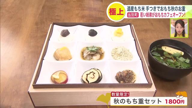 看板メニューの『秋のもち重セット 1,800円(税込)※数量限定』には、こしあん、ゴマあん、ほうじ茶きなこ、栗あんにくるみ五平餅など、秋らしい味が勢ぞろい。