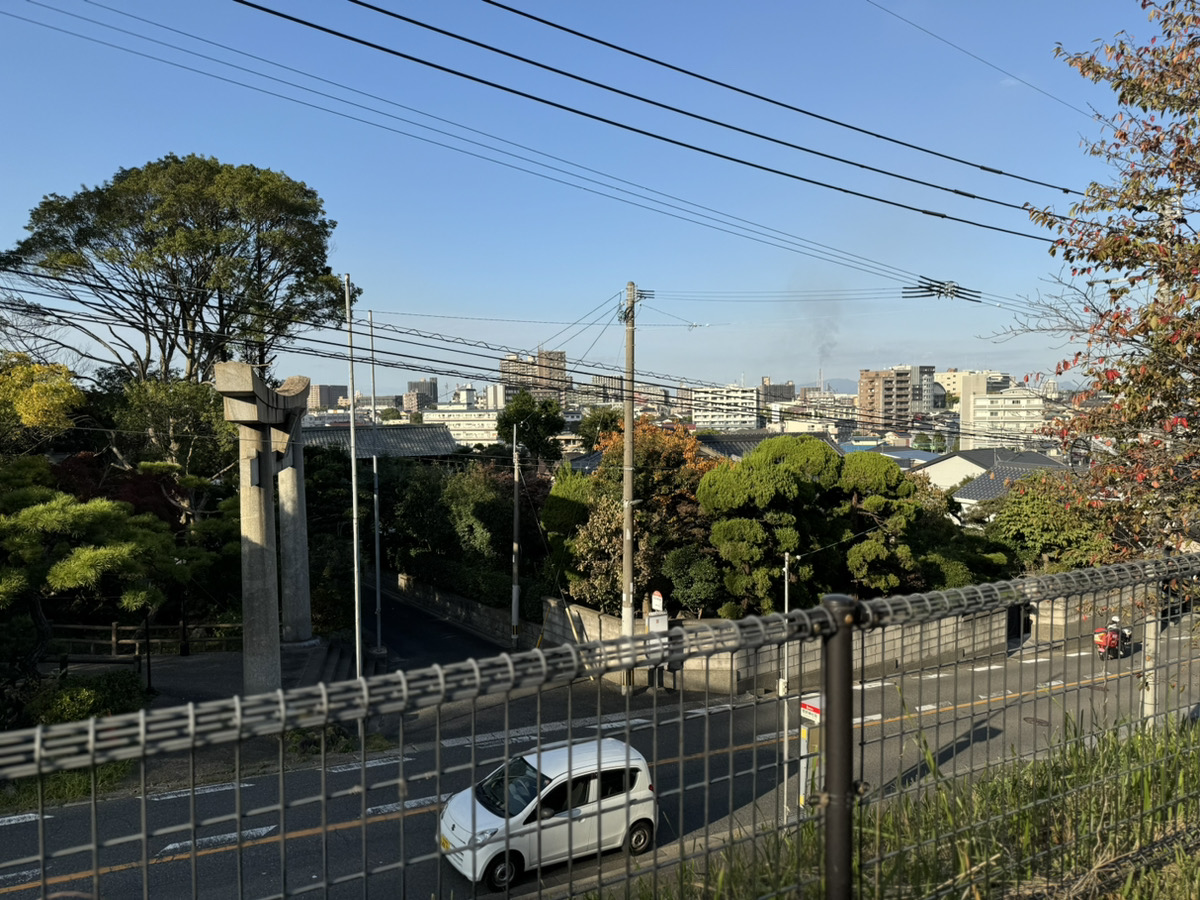 筆者が高さがある方に試しに座ってみると、目の前には菅原神社の鳥居と戸畑の街を見渡す景色が広がりました。どうやら “眺めるためのベンチ”にぴったり。