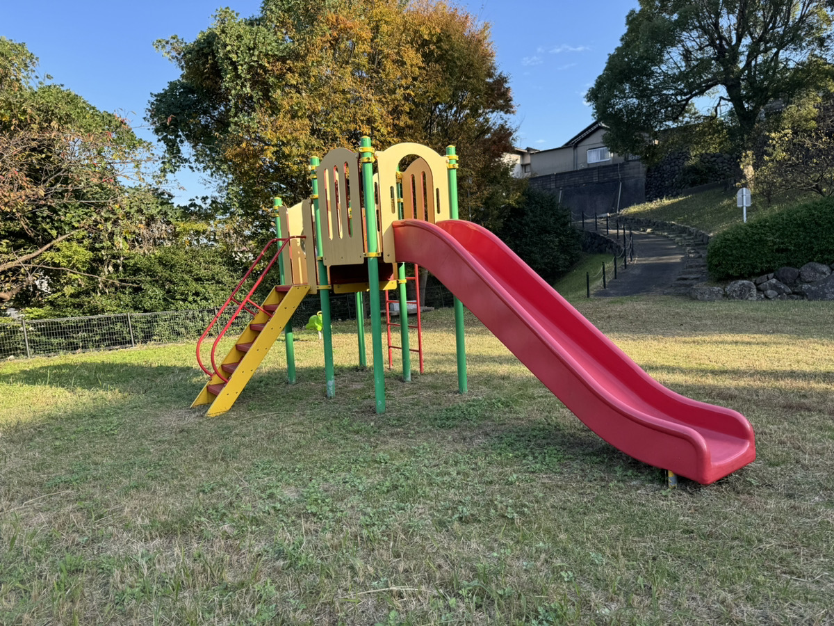平坦な曲輪のような広がりのある場所には、すべり台付きの複合遊具が1基。動物のスプリング遊具が1つ。