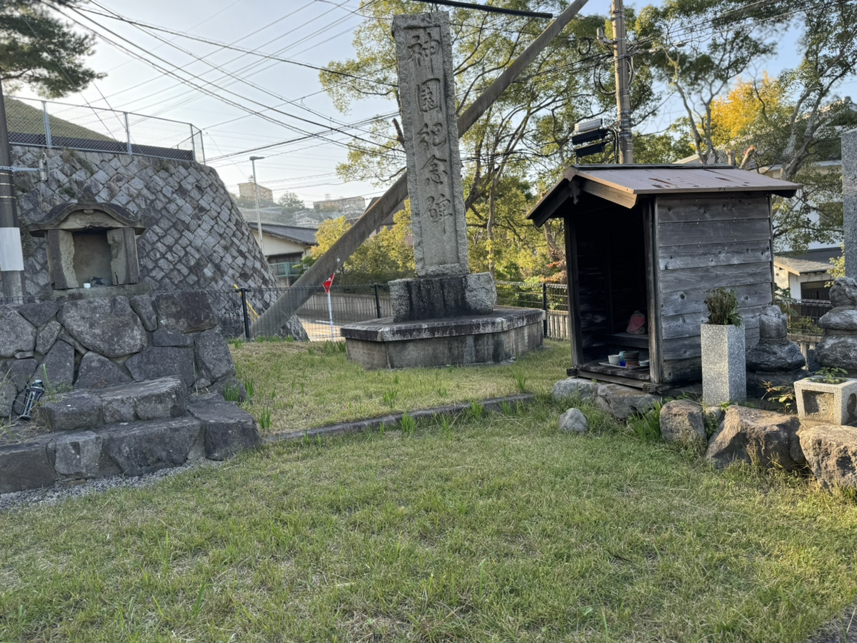 公園に入るとすぐ、神園記念碑と城址碑、そしてお墓が並んでいます。