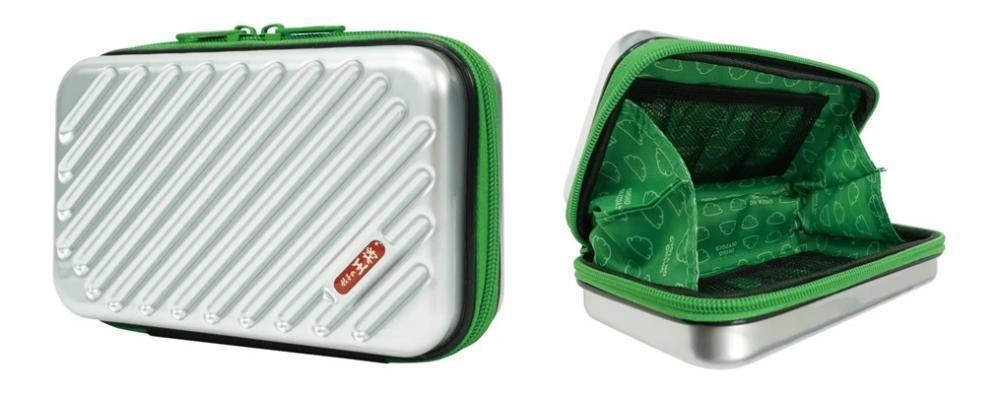 アタッシュケース風デザインのハードポーチは、外側がハードで中身が潰れにくく、持ち運びも安心です。PC・スマホ周辺機器等ガジェット類の収納にも便利。ファスナーを開けると、内側には餃子のイラストがデザインされています。