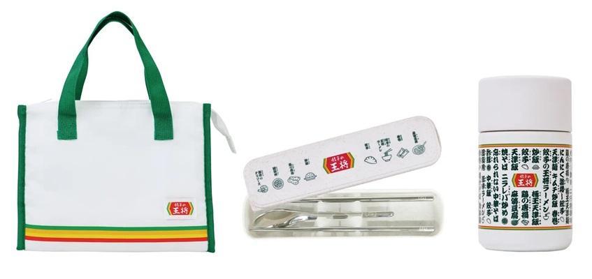 保温・保冷スープジャー(容量350ml)、箸とレンゲのカトラリーセット、保温・保冷ランチバッグがセットになった、これ一つでランチに出かけられる、手軽で便利なセットです。スープジャーは昨年好評だったマイボトルとお揃いのデザイン。店舗でオーダーを通す際に使われる"王将用語"のルビが入っています。