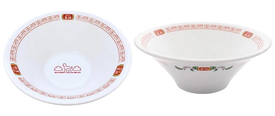 自宅でお店の気分を味わえるラーメン鉢は、深さのあるオシャレなフォルム。今年の干支の「巳(み)」と餃子の可愛いイラスト入りで、ふちのデザインは「王将」という文字がデザインされています。