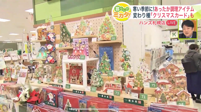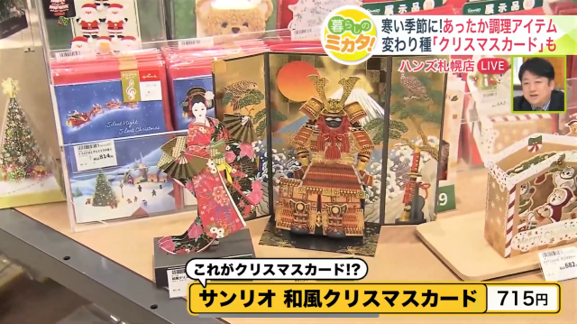 洋風のサンタさんのカードだけでなく、甲冑(かっちゅう)や金びょうぶといった和風のクリスマスカードも登場。「旅行で来られた海外のお客様がお買い求めになるケースがとても多いです」と、ハンズ札幌店の岩崎賢司さん。