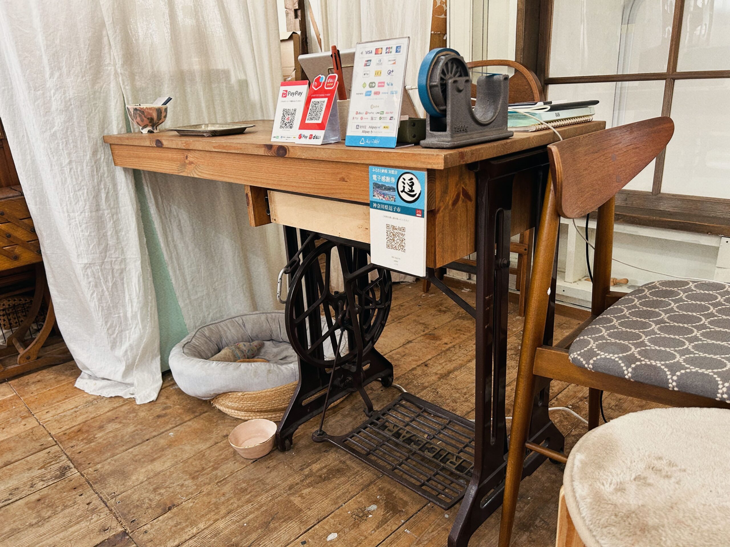 レジ台は、足踏み式のミシンの台を利用しています。こちらはハンドメイド作家さんの出品サイトで作ってもらったものだそう。お家に来たような、ひとつのお家の中のイメージをお店で表現したいと考えているそうで、什器というよりは家具などを使って落ち着く空間をつくっています。