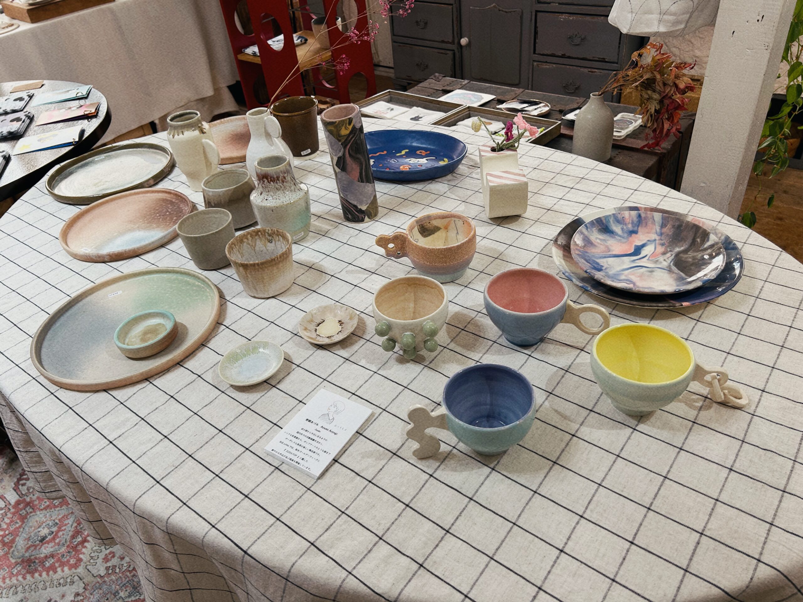 逗子にいらした作家さんで、特徴的な形や色が魅力の器。海外での活動経験がたくさんあって、日本と海外それぞれの良いところを取り入れて、ご自身で作った色で色付けされているので、他にない良さがあります。デザインもとてもかわいらしいですね。和の印象の強いものから、ポップで遊び心のあるデザインまで、どれも個性があって素敵です。