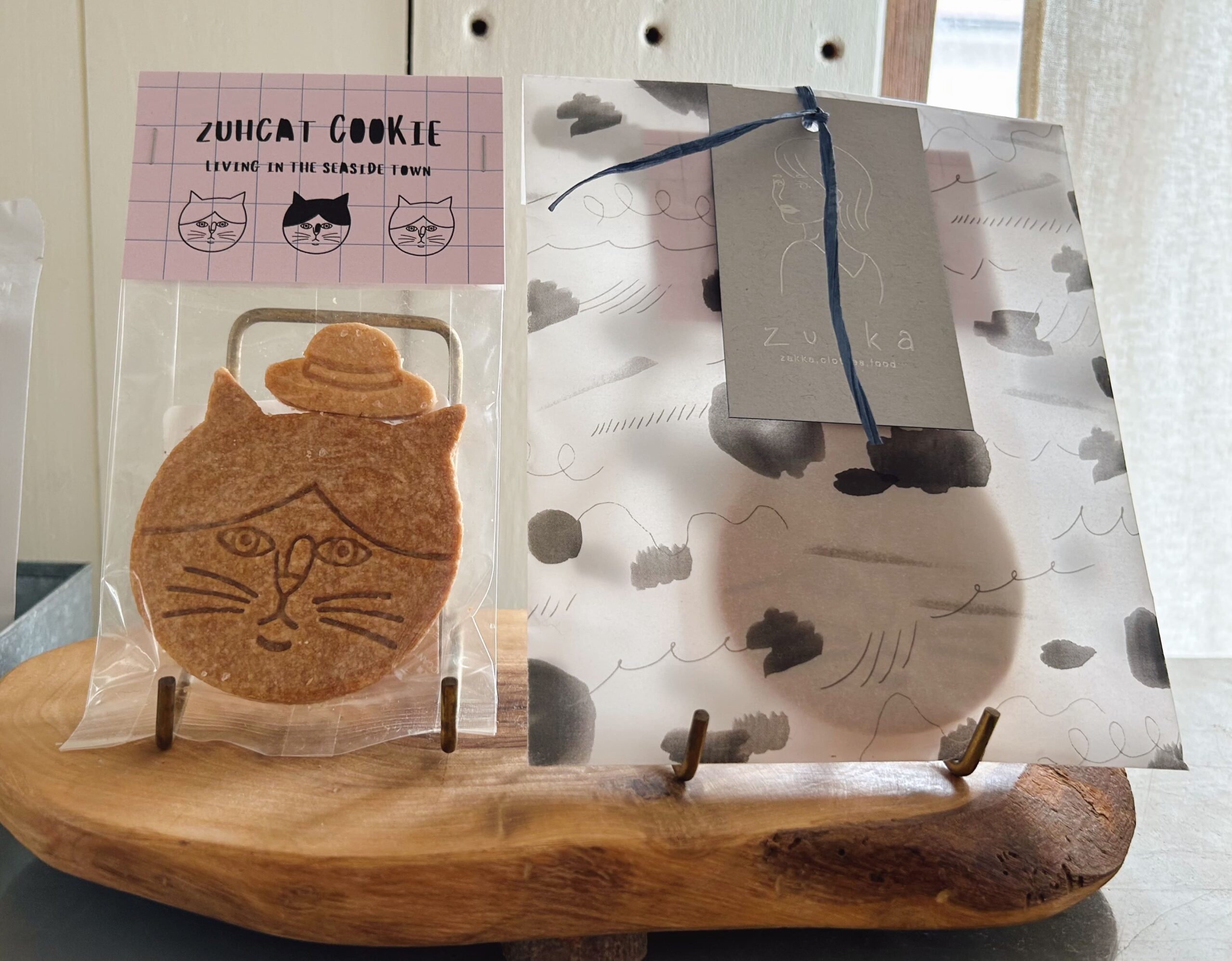 クッキーになっているこちらの猫は「ズーキャット」という名前で、Momoeさんという横浜出身のイラストレーター方に『zuhka』にいそうな猫というので作ってもらったキャラクターです。クッキーは逗子のmonさんという方が作っています。monさんは、なるべくオーガニックの素材で米粉のクッキーを作っている作家さんです。毎回色々な味で作っているので、お店を訪れるたびに味が変わっています。