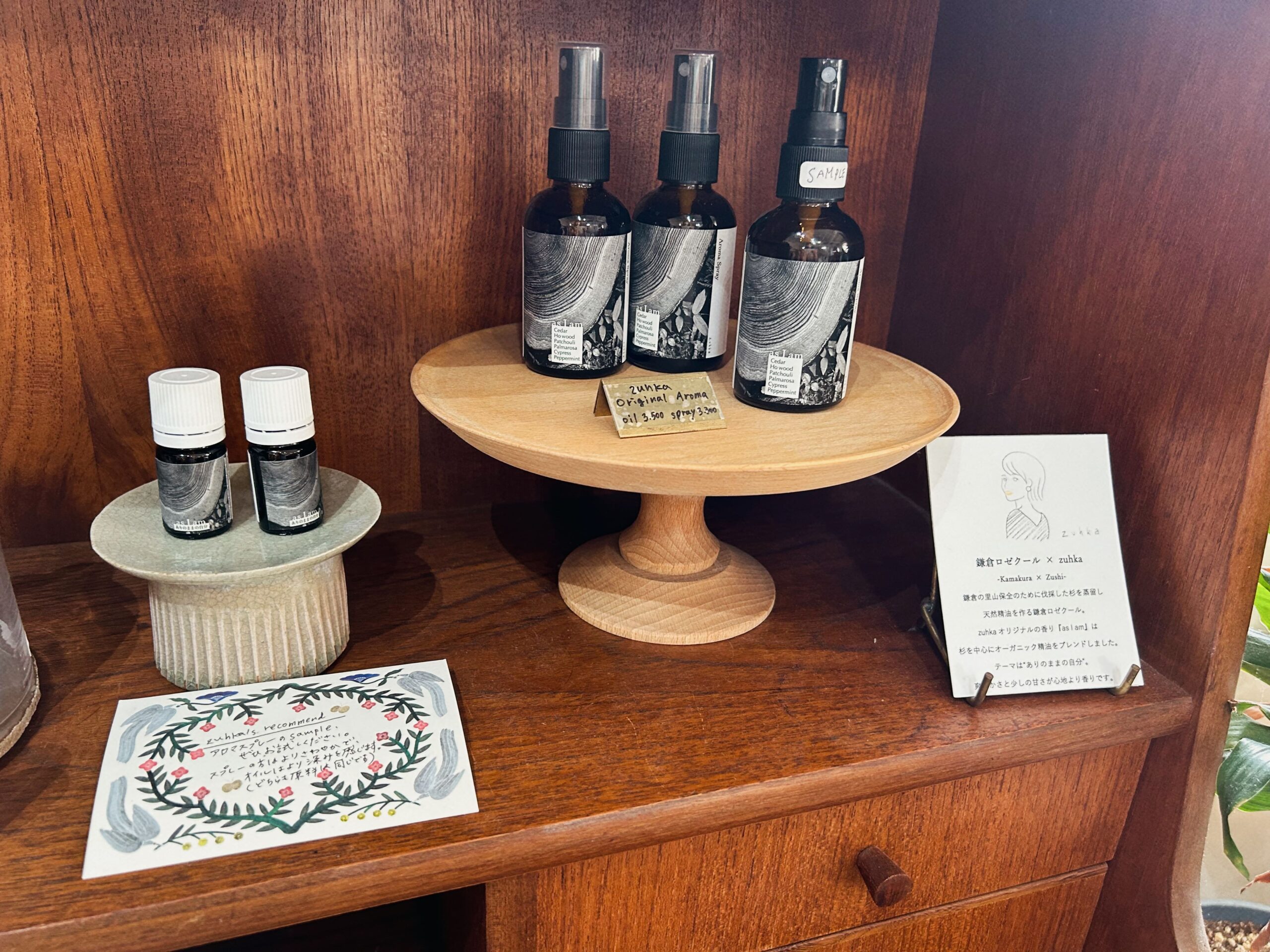 『zuhka』のオリジナルの香り「as I am」。オイル(税込3,500円)とスプレー(税込3,300円)があり、テーマは”ありのままの自分”。ギフトに選ばれることも多いお品。鎌倉ロゼクールさんに、鎌倉の杉から香りを抽出した精油をブレンドして作ってもらっているそうです。鎌倉の森を守るために伐採しなければならない杉がたくさんあり、その杉から香りを抽出しているアロマの専門家の方がいて、その方にその杉の香りと色々なオーガニックの香りをブレンドして作ってもらったオイルとスプレーです。