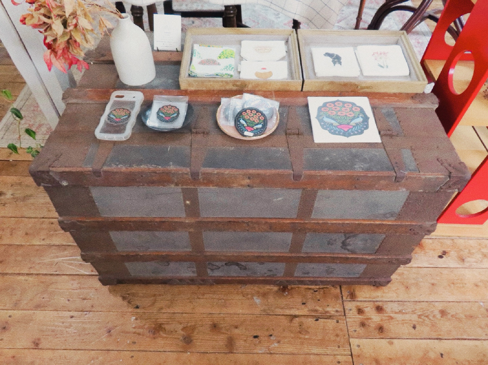 什器として使用しているこちらの古いトランクは、tsukimotoさんという横須賀にあるお店から譲ってもらったもので、大正時代に実際に輸送用などで使われていたもの。「昔から長く使われているものや、誰かが手をかけてきたものは、空間に馴染むというか落ち着く感じがあります。