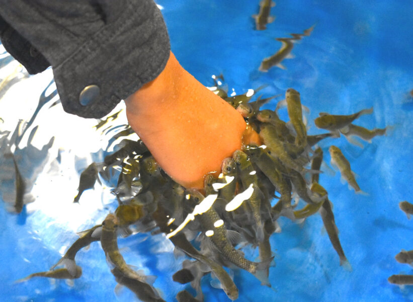 ガラ・ルファはトルコやイランなどの西アジアの河川に生息するコイ目コイ科の魚で、10センチほどに成長。水温28〜34℃の温泉や渓流で生育しています。