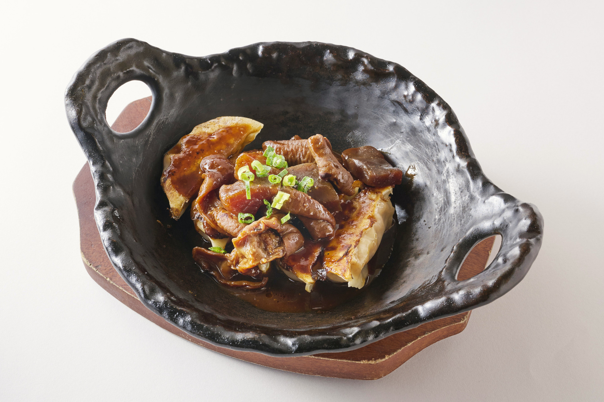 八丁味噌でじっくり煮込んだモツ、大根、こんにゃくを餃子の上に豪快にトッピング。