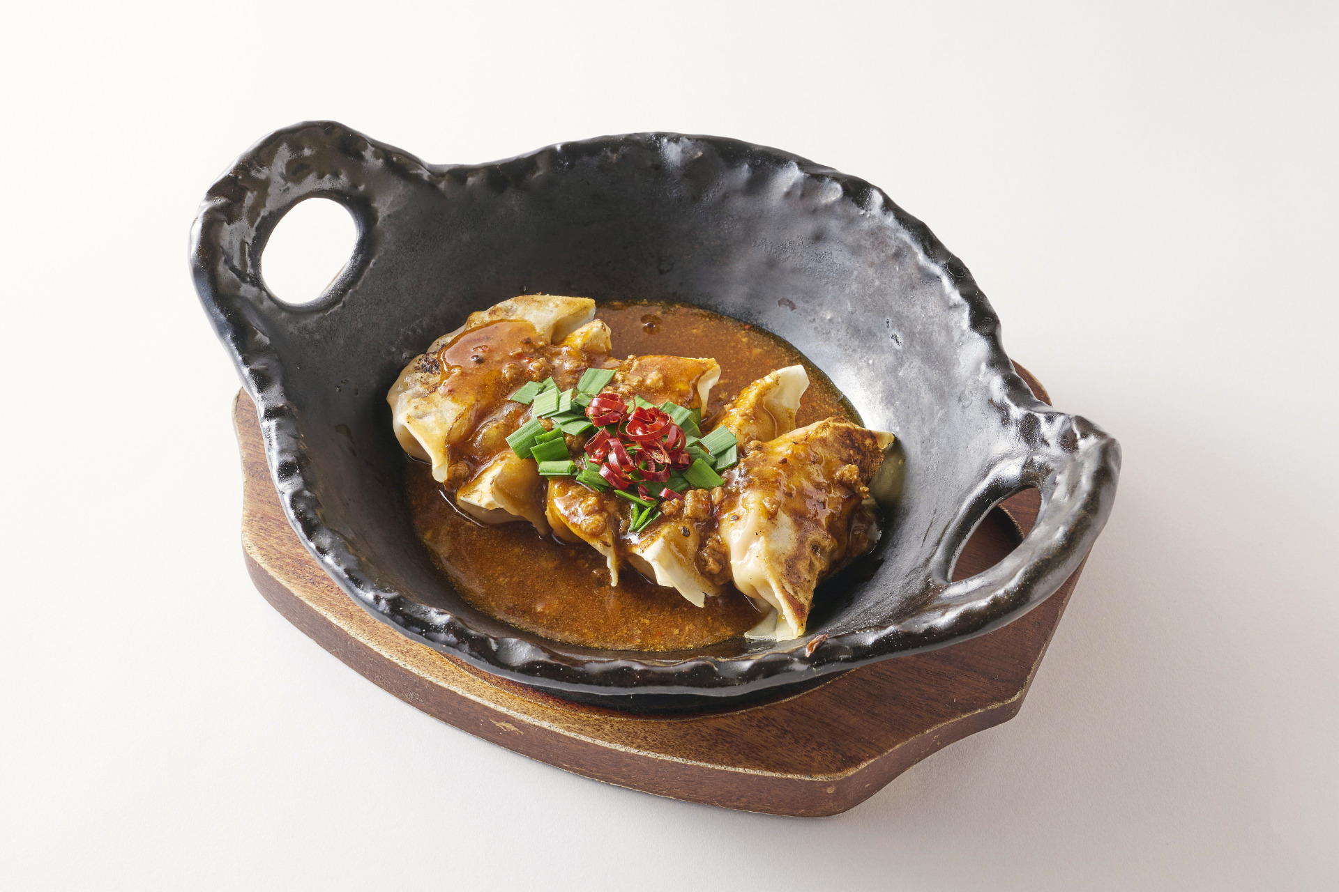 花椒(ホアジャオ)の痺れが効いた特製麻婆ソースをたっぷりと餃子にかけ、辛党にはたまらない刺激的な味わい。