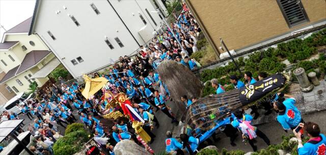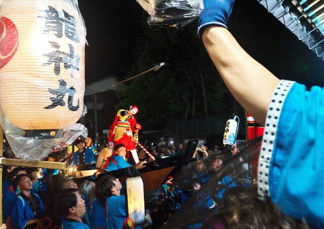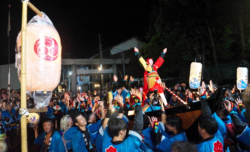 四日市市楠町南五味塚地区の伝統行事「南楠鯨船まつり」が10月11日から2日間にわたって行われた。幕末頃から年中行事として続くこの祭礼は、初日に南御見束神社の神様が社殿から出て鯨船に移る「出船」に始まり、2日目夜の「入船」で再び社殿に戻る。12日夜、同神社の境内は、巡行の締めくくりにふさわしい熱気に包まれた。