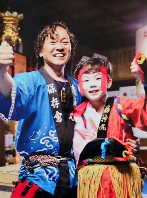 乃祐さんの息子・湧飛さん(楠中2年)も、6年生だった2年前のまつりで踊り子を務めた。入船の後、拝殿内で撮影した写真が今も家族の宝物になっている。地域を挙げてのまつりの中、親から子へ受け継がれる鯨船の魂が息づいている。