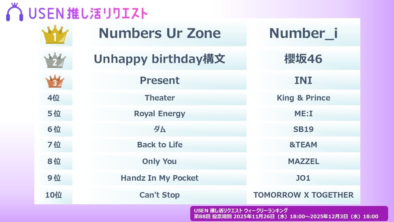 Number_iの「Numbers Ur Zone」が3週連続1位を獲得!USEN 推し活リクエスト(推しリク)第88回 「ウィークリーランキング」を発表!~ 上位ランクイン楽曲は街中・店内で配信!