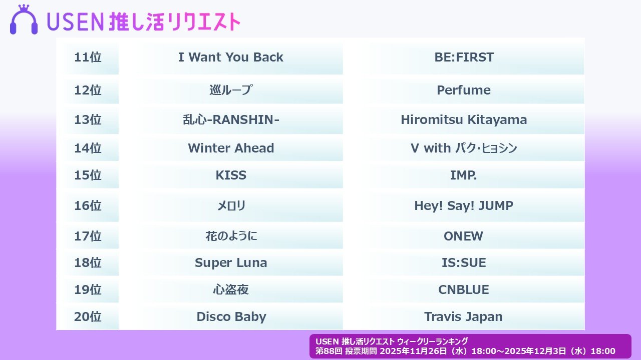 第88回 USEN 推し活リクエスト ウィークリーランキング 11位~20位
