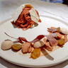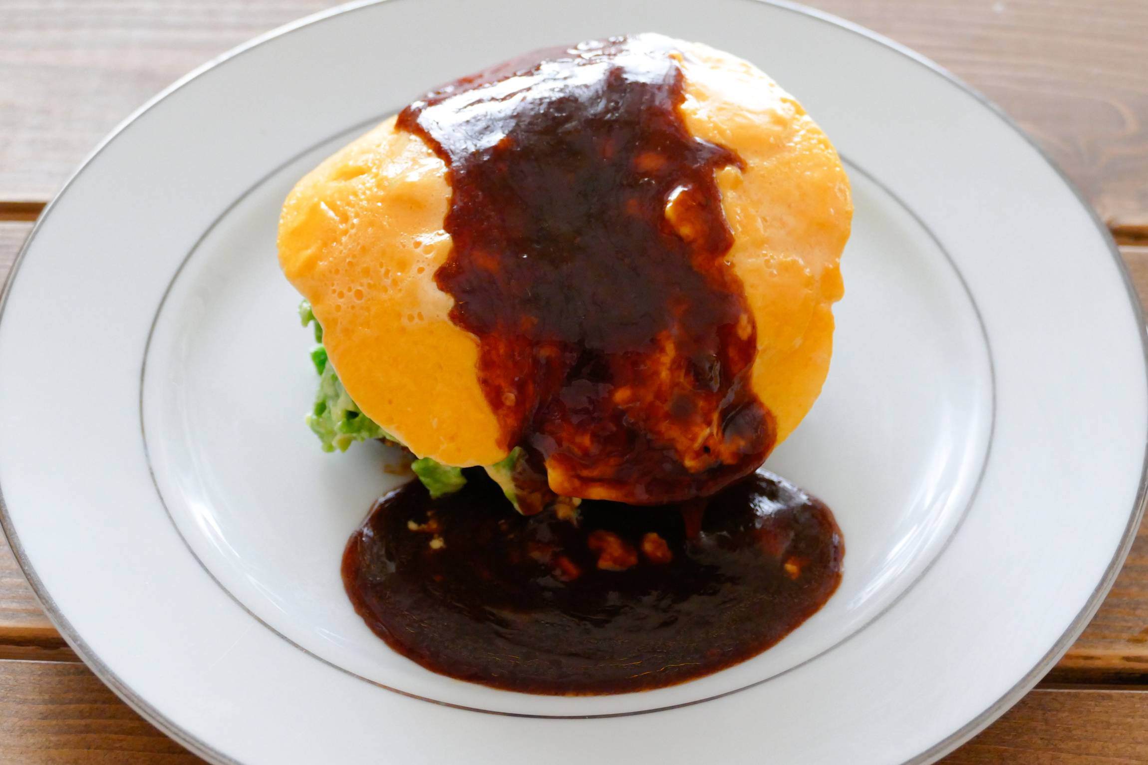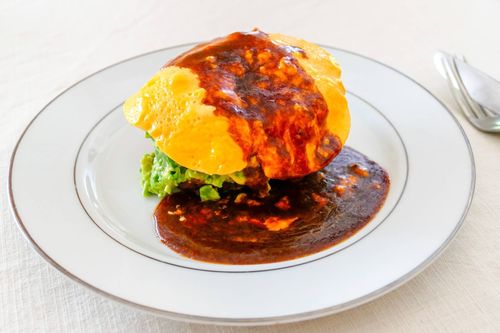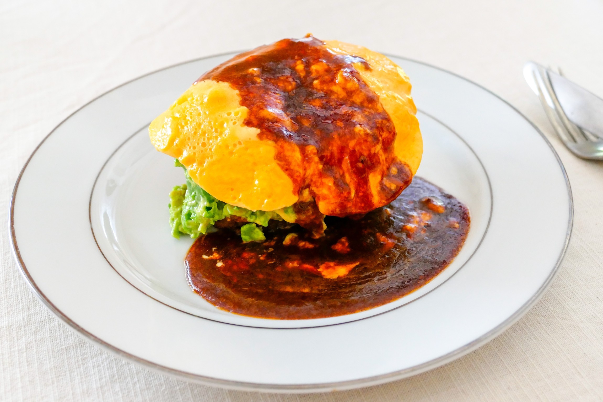 金のハンバーグを皿の中心にのせ、アボカドソースを重ねます。ボウルに入っているオムレツをすべらせるようにしてのせ、袋に残っているデミグラスソースをかけて完成です。