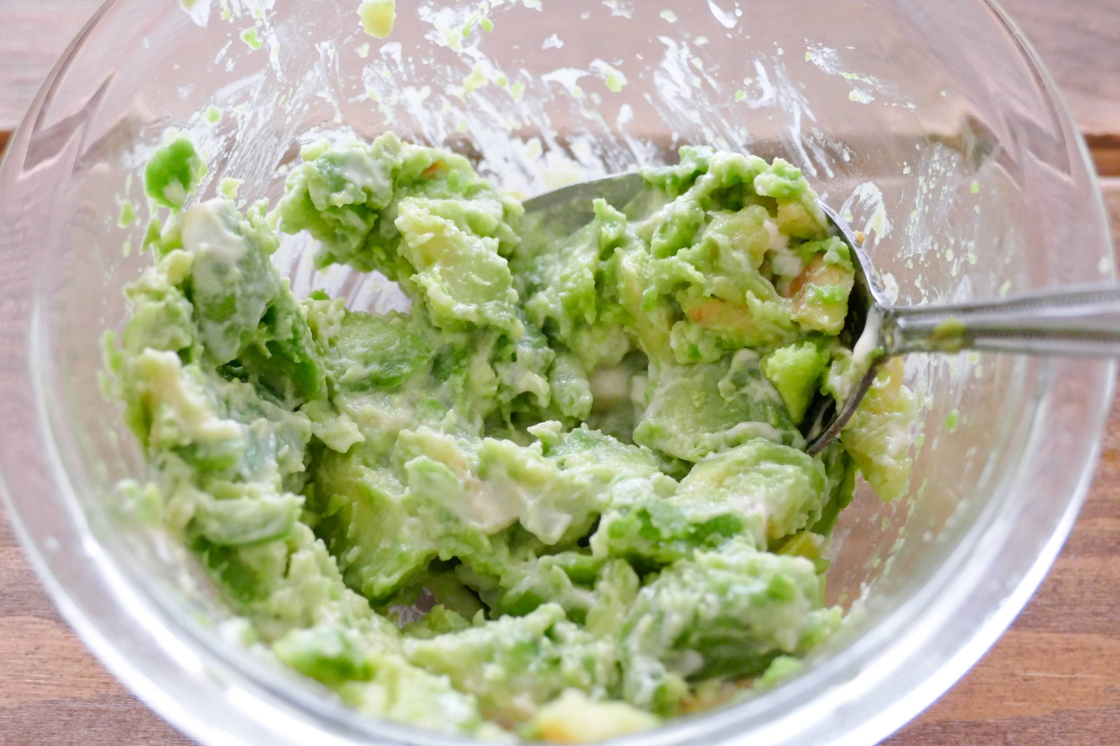 アボカドをスプーンで適当な大きさに切るように潰し、マヨネーズを加えてよく混ぜます。