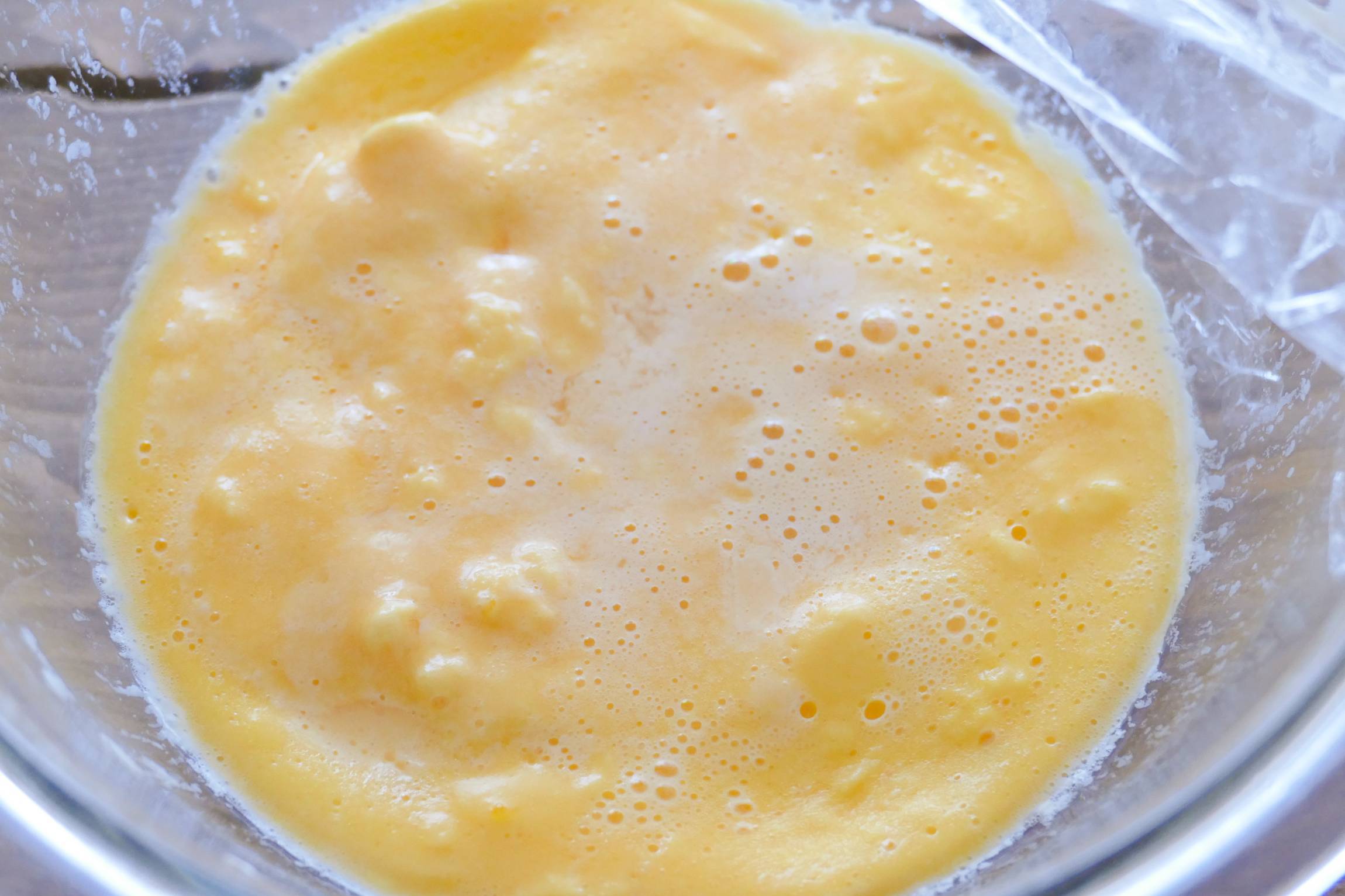 ラップをかけて電子レンジ500Wで1分から1分半加熱します。表面は半熟で中心は固まりきっていない状態です。