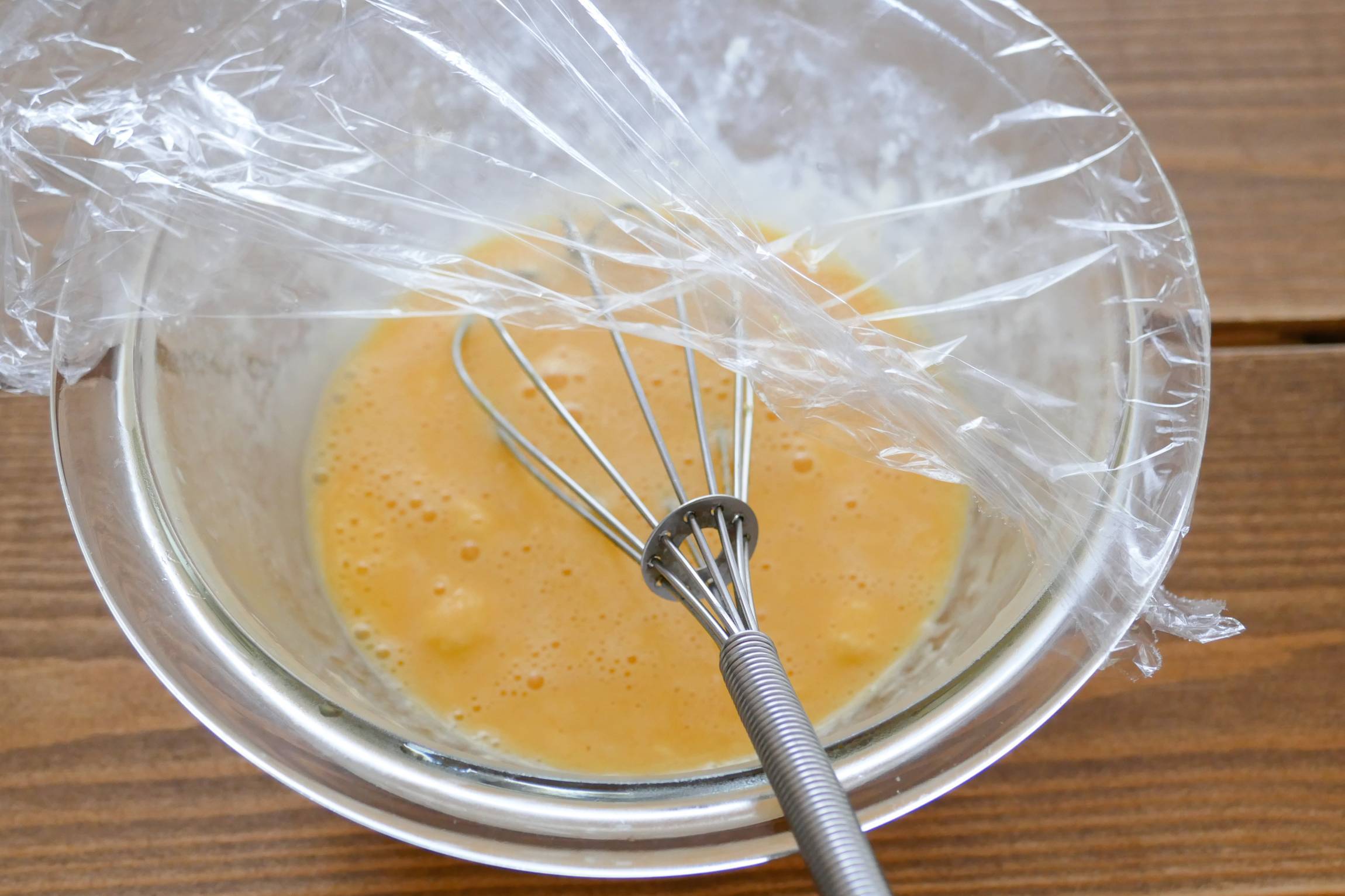 大きめのボウルに卵とマヨネーズを入れ、全体が均一になるまでよく混ぜたら、ラップをふんわりかけて電子レンジ500Wで1分加熱し、一度取り出して全体をよく混ぜます。