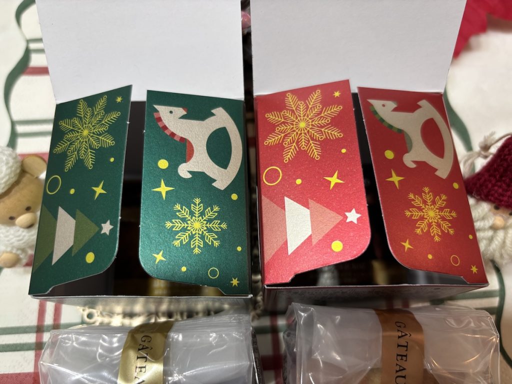 クリスマス トリュフケーキとクリスマス ガトー・オ・マロンのパッケージを開けてみると、クリスマスツリーに木馬、雪の結晶を発見。ブールミッシュのパッケージは細部にまでこだわっており、いつもこちらをワクワクさせてくれる。パッケージの側面や底など、ぜひみなさんも今後注目してみてほしい。