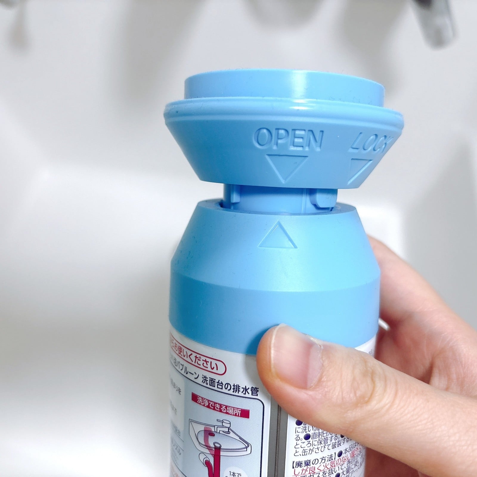 手順2.ノズルをOPENに回し、排水口に「らくハピ マッハ泡バブルーン」を噴射します。