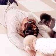 「あそぼっかぁ」と座っている飼い主さんの膝の上に登ったコロッケくん、お尻に体重をかけて飼い主さんを倒すという力技を発動させます。しかし百戦錬磨の飼い主さん、「ドアを閉めて」と指示を出すことでコロッケくんにどいてもらうことに成功。