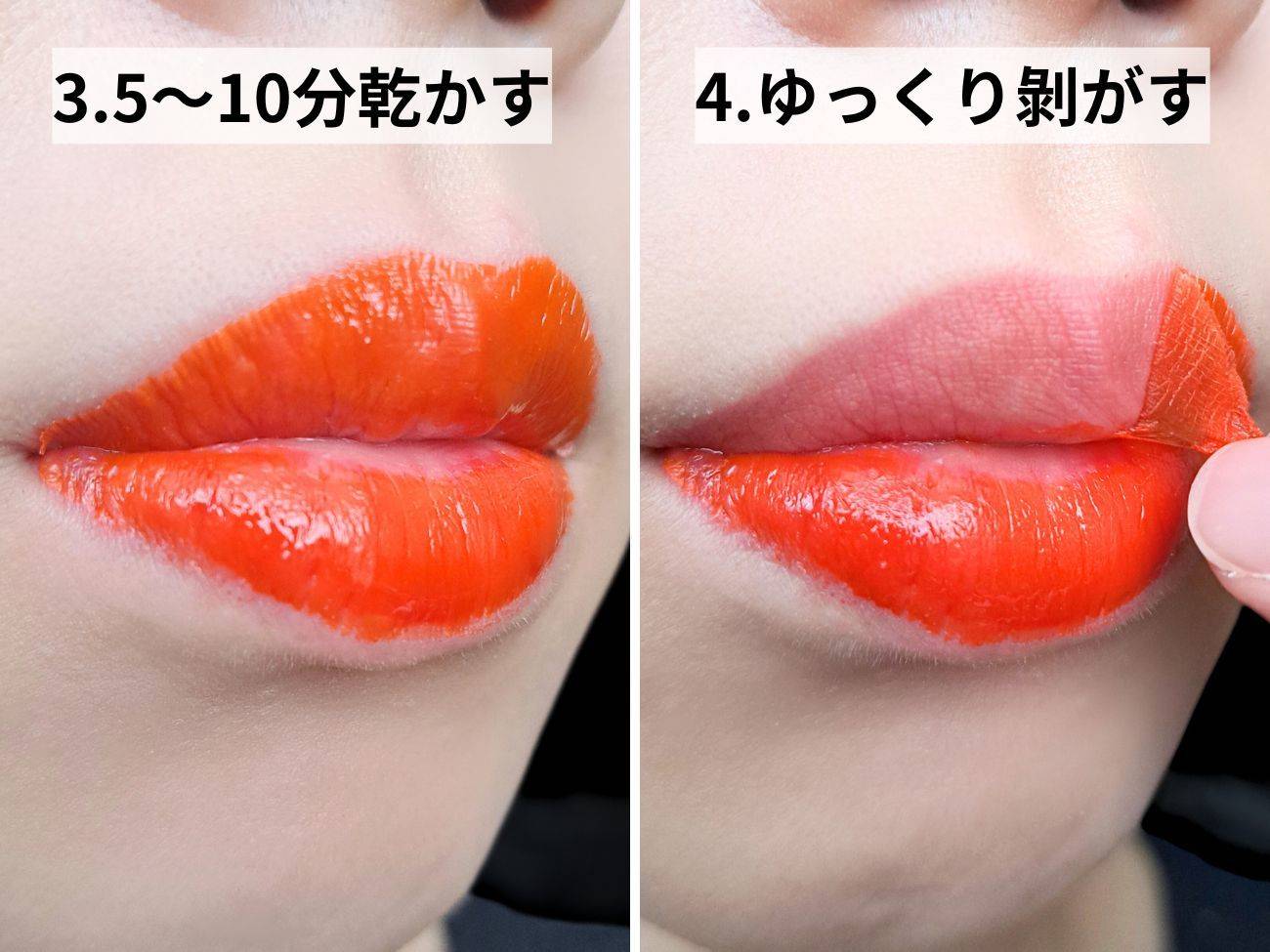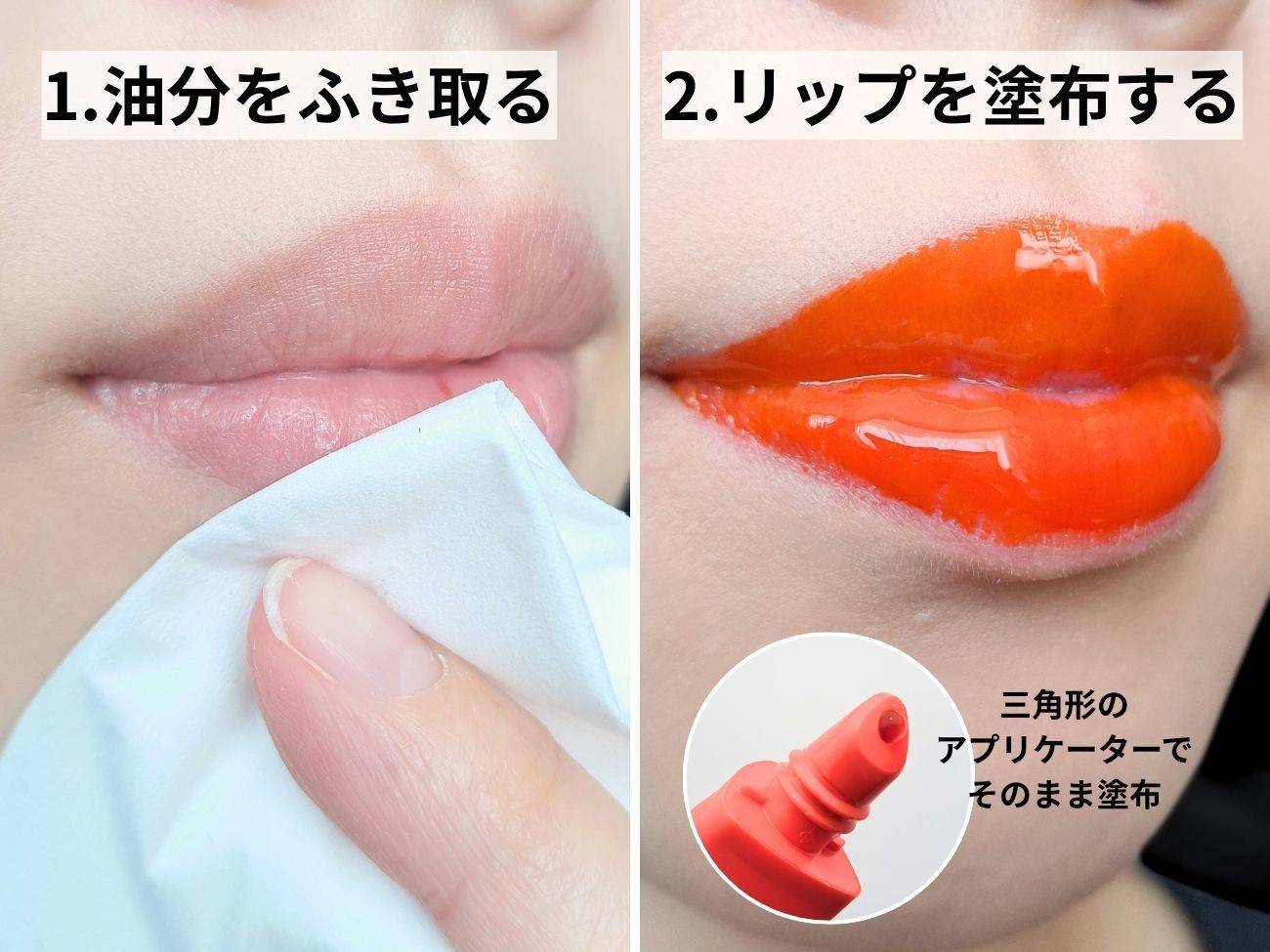 液をしっかり出し、唇に押し付けながら塗るのがポイント。はみ出た部分は綿棒で整えるときれいに仕上がります。