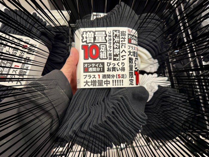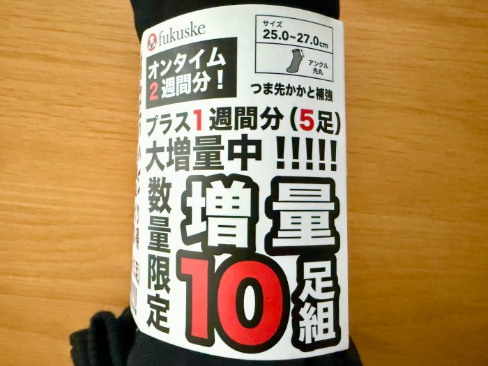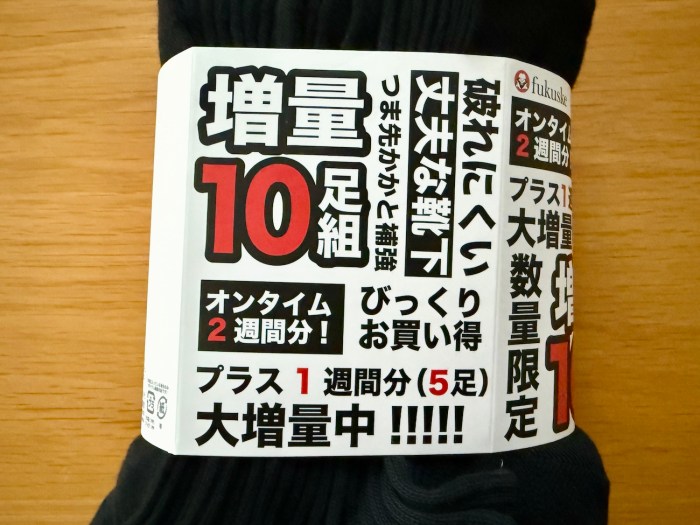パッケージには「増量10足組」「オンタイム2週間分!」「プラス1週間分(5足)大増量中!!!!!」と書いてあった。つまり普段は5足980円で売っているのだろう。それが2倍増量で同価格! もはや事件である!
