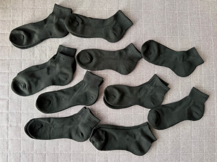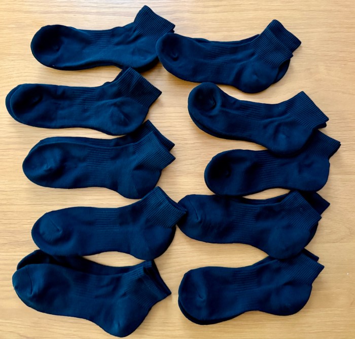 とりあえず10足すべてを並べてみると……カラスの大群みたいで少し不気味だが、逆に言うとそれだけ頼もしい布陣でもある。10足の真っ黒な靴下は今後の作業のお供となるだろう。