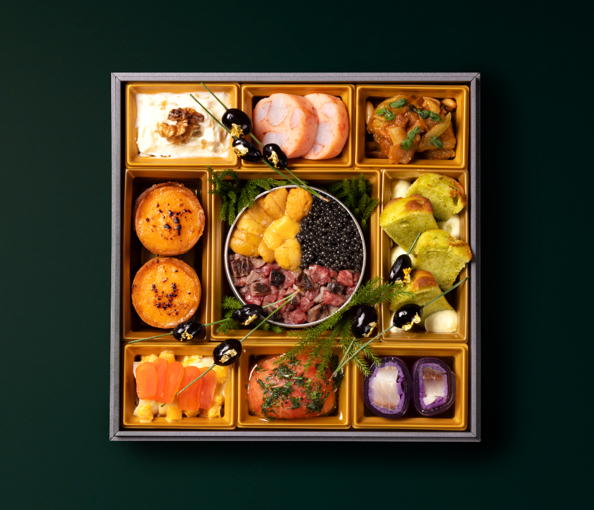 壱の重:「信州プレミアム牛 雲丹 キャビアのタルタル トリュフ風味」「角長千尋海老のサラミ仕立て」「シャドークイーンなます 鯖の酢締め」など、新年の乾杯にピッタリな11品。