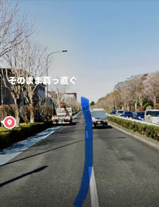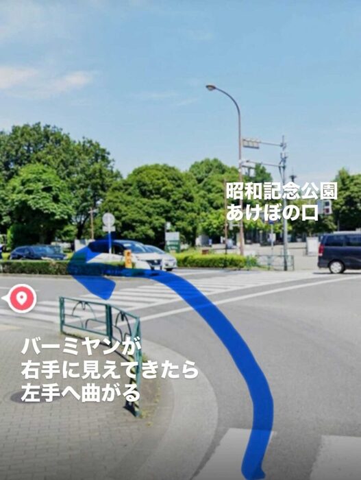 正面に昭和記念公園、右手に『バーミヤン 立川駅北口店』が見える交差点についたら左折。