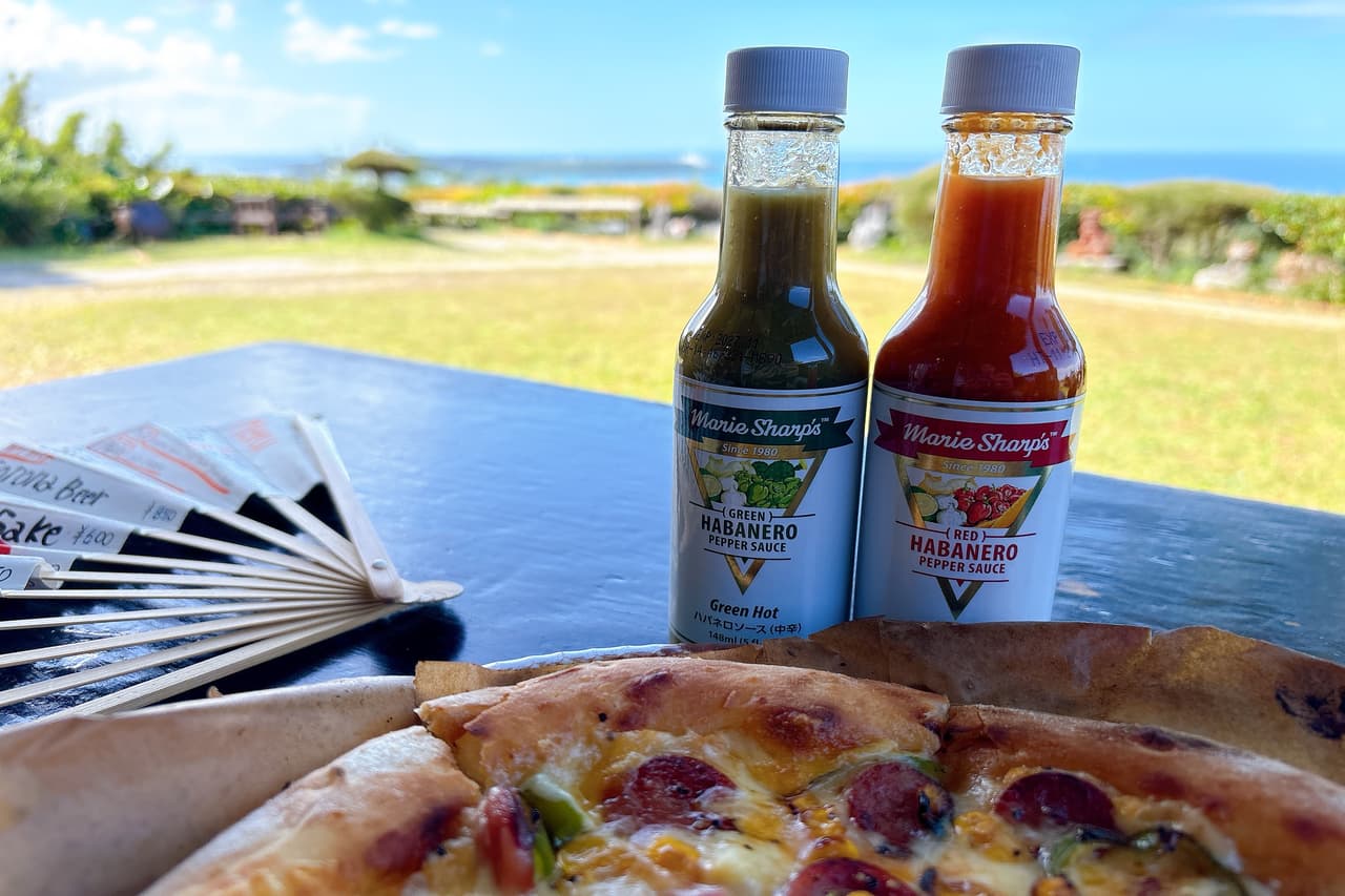 まだまだお楽しみはこれから♪ 卓上にならぶ「マリーシャープス」のハバネロソースで、ピザの味わいに深みをプラスしていきましょう。 右側の赤いホットをひとふりすれば、ほどよい辛さがトマトソースの酸味と重なり、野菜の旨みをぐっと引き立てます。香ばしい生地のあとに、ハバネロ特有のスッと抜ける辛味が追いかけてきて、思わずもう一口。辛いのが少し苦手な方でも、素材の風味を損なわずに楽しめる心地よい刺激です。 そして左側のグリーンホットは、ウチワサボテンが醸し出す爽やかな風味が特徴。トマトソースの酸味を引き立て、ピザ全体が一段と軽やかに。 2種類のソースを食べ比べてみると、同じピザとは思えないほど表情が変わるのがおもしろいですね。ぜひ、試してみてください♪