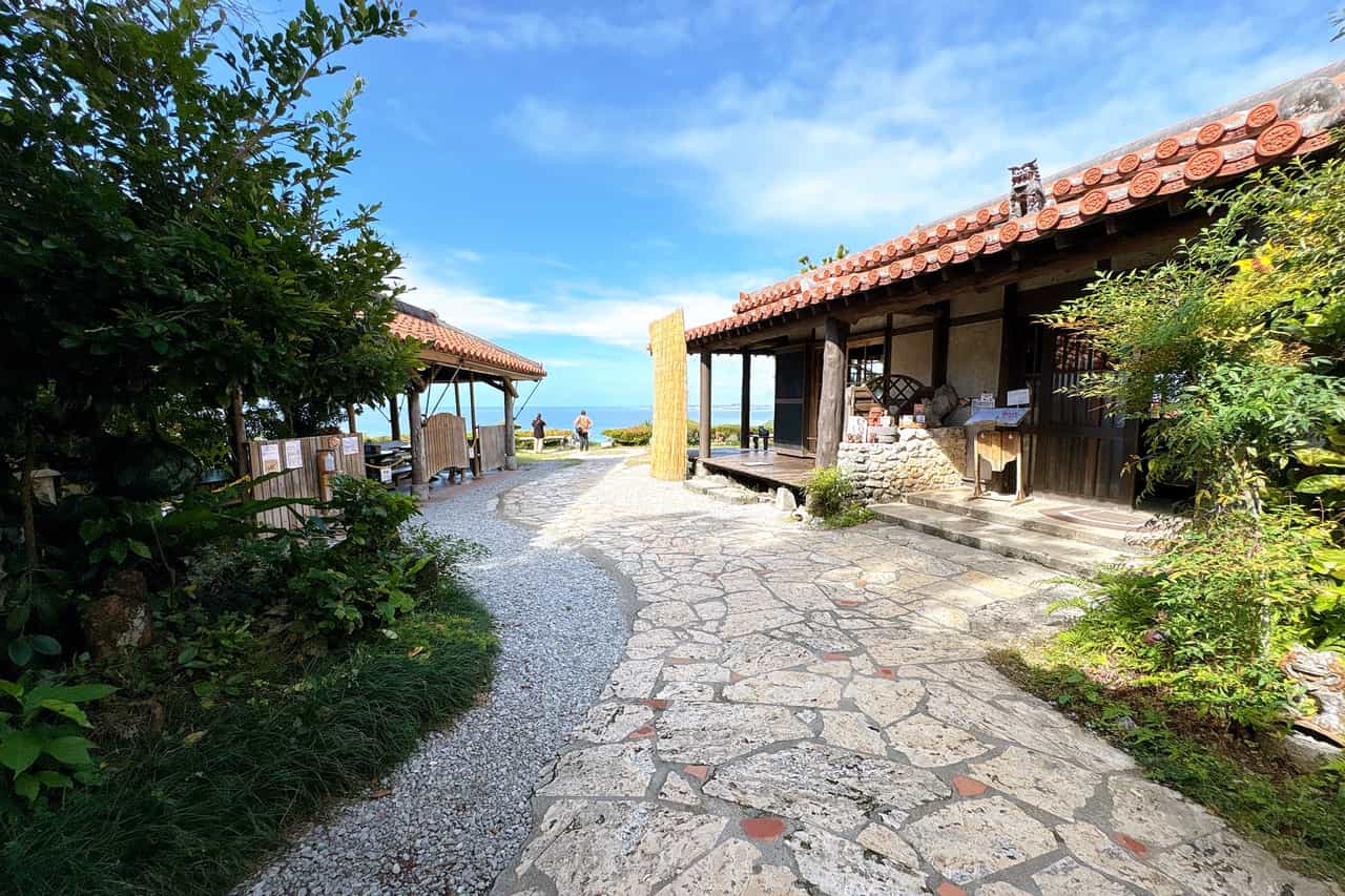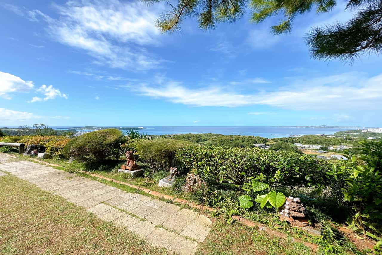 庭園のところどころにあるシーサーは、久場さんのお母さまが趣味で集めたものや久場さんご自身で作ったものだそうです。 目の前に広がる透きとおった青空ときれいな水平線。晴れた日であれば瀬底島、伊江島、水納島がはっきりと見える、まさに絶景です。