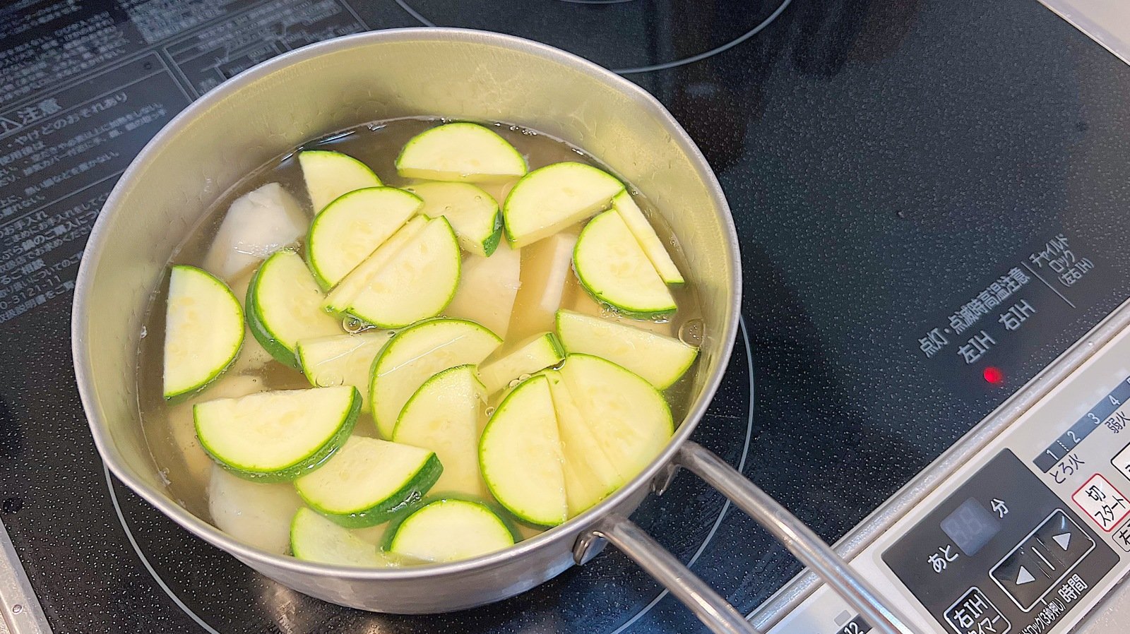 2 沸騰したら火を弱めて、半月切りにしたズッキーニを入れる。