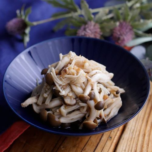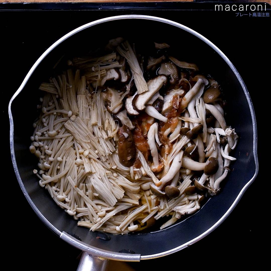 2: 鍋にきのこを入れて梅干しと煮汁の材料を加えて混ぜ、中火にかけます。