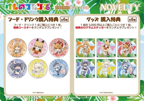 ご購入特典としてフード・ドリンク1点ご購入につき1枚特典コースターが、グッズを1会計3,000円以上ご購入ごとに1枚特典ホログラムステッカーがいずれもランダムにてプレゼントされます。
